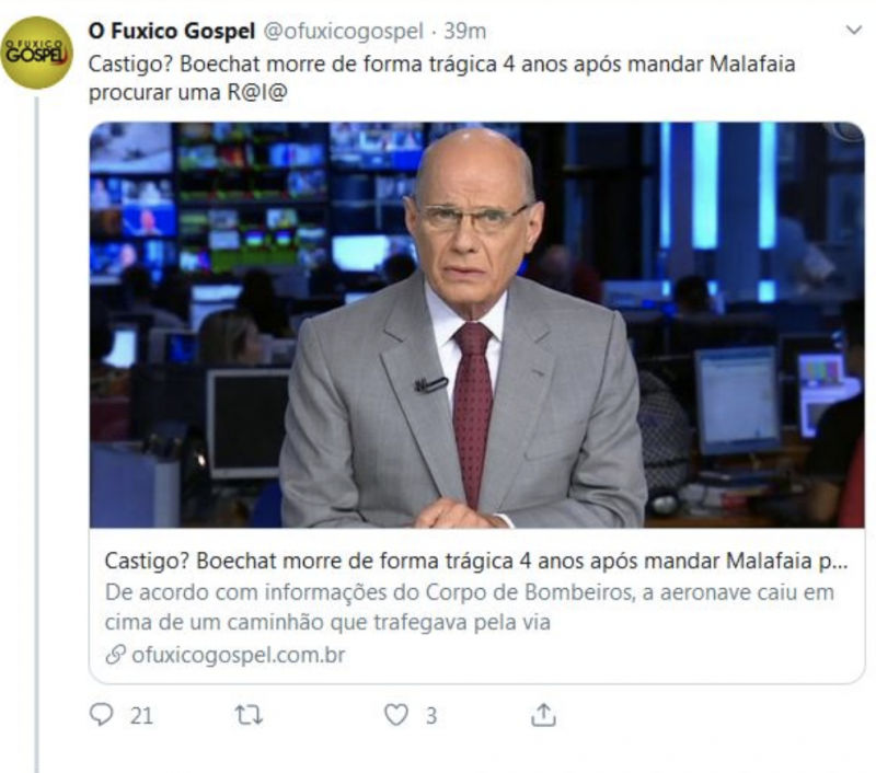 Com o anúncio da morte de Boechat, as redes sociais se encheram de comentaristas dizendo que o jornalista foi morto por atacar “um ungido de Deus”.