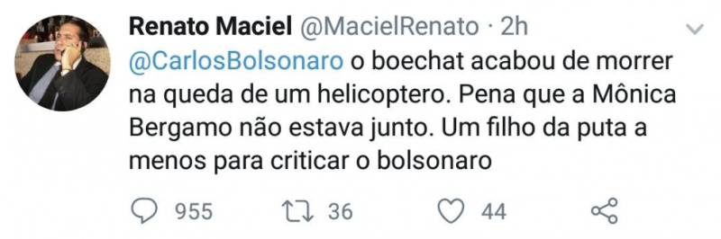 Já o perfil de Renato Maciel, que se identifica como “economista, administrador, contador, mestre, auditor e executivo em gestão empresarial” desejou a morte da jornalista Monica Bérgamo, da Folha de S. Paulo.