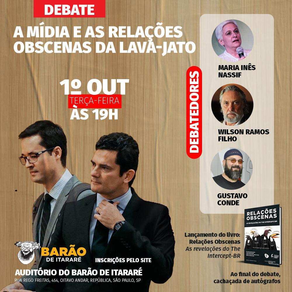 No dia 1º de outubro, será em São Paulo, durante o debate “A Mídia e as Relações Obscenas da Lava-Jato”, promovido pelo Centro de Estudos de Mídia Alternativa Barão de Itararé.