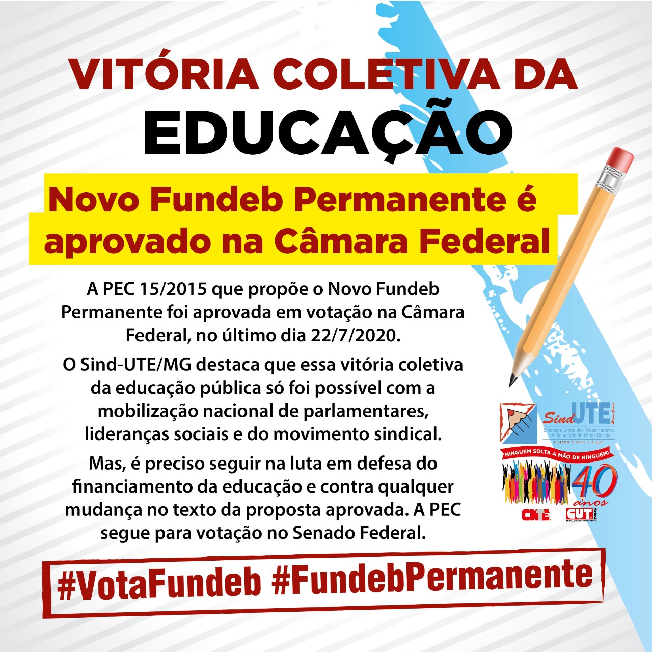 O card do Sind-UTE/MG publicado nesta quarta-feira, 22-07, nas redes sociais sintetiza bem esta união em prol da Educação pública de qualidade à população brasileira.