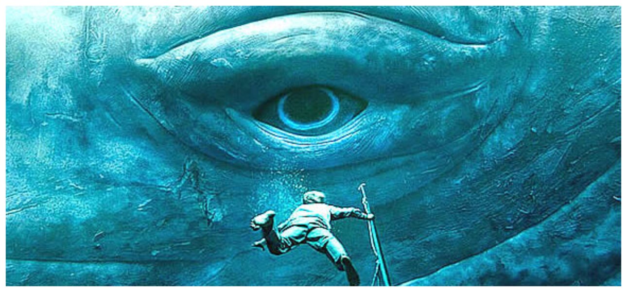 Nunca esqueço do texto do Aldir Blanc, lá do livro Rua dos Artistas e Arredores. “Estava com o capitão Ahab […] em busca do terrível cachalote, quando tocou a campainha…”. Perfeição de figuras literárias e poéticas. Ave, Aldir! E no filme O Ladrão de Sonhos, de Jean-Pierre Jeunet e Marc Caro, o arpoador One, (Ron Perlman), perguntado do porquê abandonou a caça de baleias, responde: um dia eu vi o olhar de uma baleia. Depois disso nunca mais consegui acertar o alvo…! O tema ribomba de lugares diversos.
