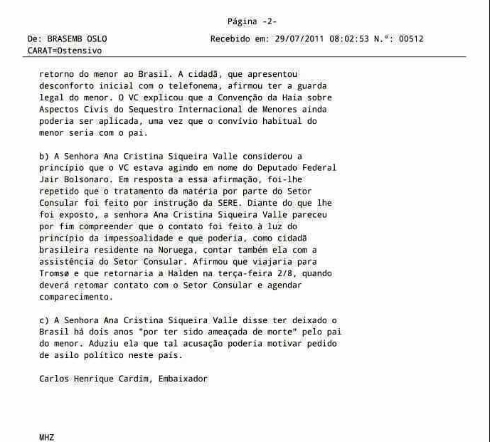Em 2011, a Embaixada do Brasil na Noruega entrou em contato com Ana Cristina para questionar porque ela havia se mudado para o país europeu com o filho, então adolescente, sem uma autorização expressa do pai.