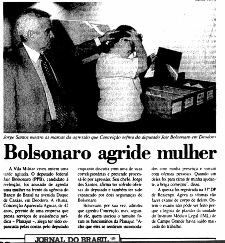 Em 27 de agosto de 1998, durante campanha eleitoral para se reeleger deputado federal, Bolsonaro esmurrou por trás a cabeça de Conceição Aparecida, então funcionária da Planajur, empresa de consultoria jurídica que prestava serviços para o Exército.