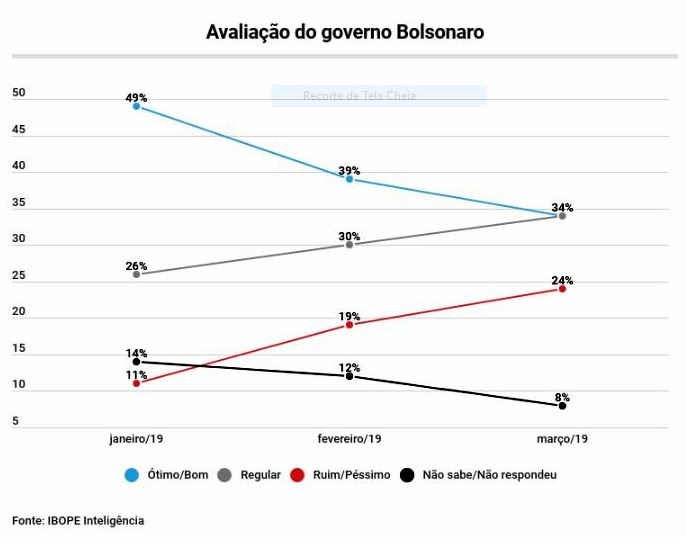 Os 34% de ótimo/bom de Bolsonaro equivalem à taxa de José Sarney em março de 1987, quando haviam decorrido dois anos de mandato do primeiro presidente civil depois do golpe de 1964.