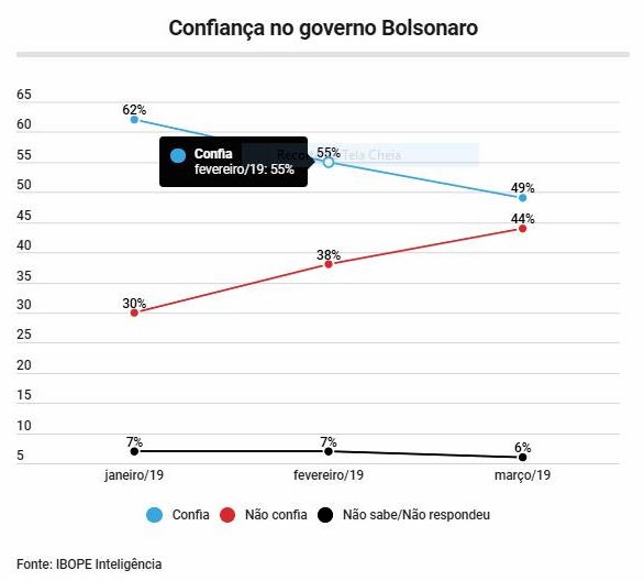 Em menos de três meses no cargo, Bolsonaro polarizou a confiança dos brasileiros. Se 62% diziam confiar no presidente em janeiro, só 49% ainda confiam nele agora. Perda de 13 pontos. Ao mesmo tempo, a desconfiança saltou de 30% para 44%.
