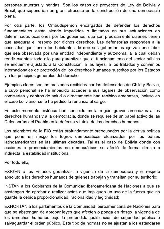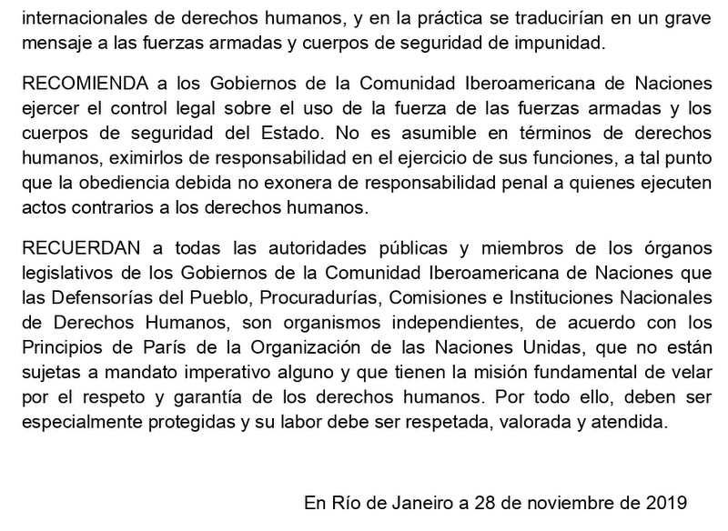 “Neste momento histórico, sérias ameaças aos direitos humanos e à democracia convergiram na região, o que demanda um papel ativo dos Ombudsman na defesa e proteção dos direitos humanos”, destaca o texto.