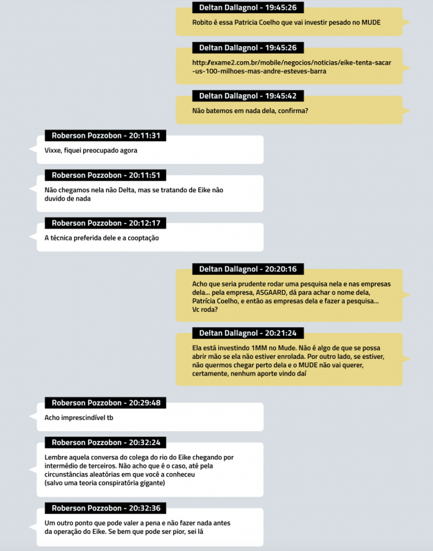 O nome da consultora de Eike Batista e “investidora anjo” do Instituto Mude, Patrícia Coelho, apareceu nas investigações da Operação Lava Jato, e foi Deltan Dallagnol quem deu a notícia para os colegas, no dia 25 de outubro de 2017: