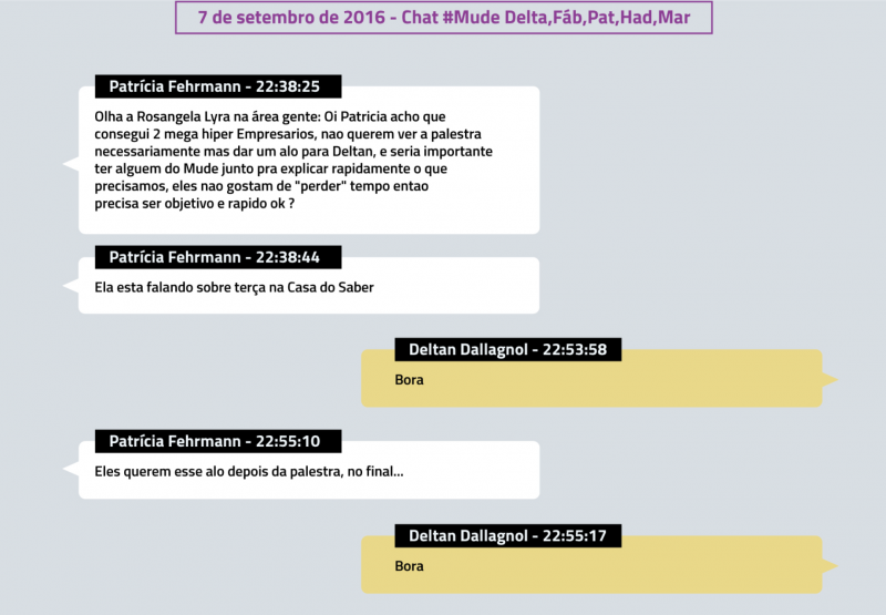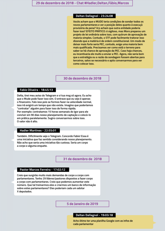 Ele e os integrantes do Mude que participavam do chat – Fábio Oliveira, Patrícia Fehrmann, Hadler Martines e o pastor Marcos Ferreira – se encontraram com Patrícia Coelho dia 8 de setembro daquele ano no Rio de Janeiro, de acordo com os diálogos no Telegram.