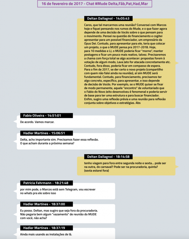 No mesmo chat, Deltan Dallagnol afirmou que poderia pedir recursos para um empresário da Opus Dei e convocou uma reunião com os membros do Instituto Mude na sede da Procuradoria para discutir os rumos da entidade.