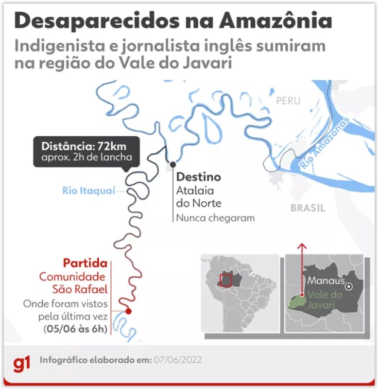Bruno e Dom desapareceram em 5 de junho no Vale do Javari, no Amazonas. Eles partiram da Comunidade São Rafael rumo a Atalaia do Norte, viagem que dura aproximadamente duas horas, mas não chegaram ao destino.