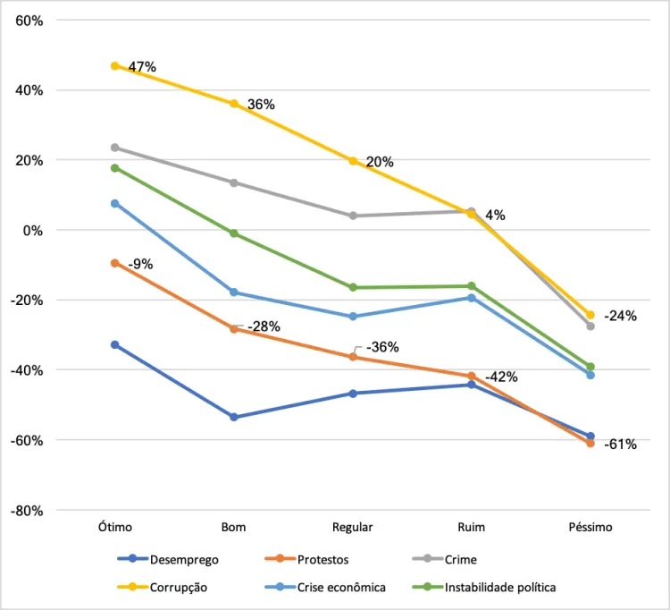 Por exemplo, o ponto mais alto do gráfico, que marca 47% na curva da corrupção, é resultado da diferença entre os 72% que apoiam o golpe em caso de alta corrupção e os 25% que não apoiam, no grupo daqueles que consideram a gestão de Bolsonaro ótima.