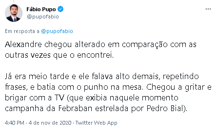 Fábio Pupo, a terceira testemunha, descreveu o que viu no Twitter e chegou a ser notificado pelo advogado de Alexandre, mas não tirou a publicação do ar.