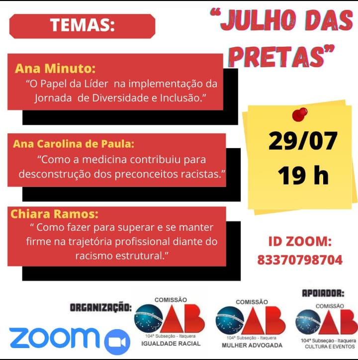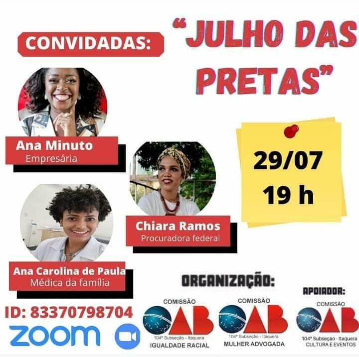 Em alusão ao Dia Internacional da Mulher Negra Latina-americana e Caribenha e ao Dia Nacional de Tereza de Benguela e da Mulher Negra, ambos celebrados na data de 25 de Julho, a Comissão de Igualdade Racial em conjunto com a Comissão da Mulher Advogada, com apoio da Comissão de Cultura e Eventos da OAB Subseção de Itaquera – SP convidam para o evento: “JULHO DAS PRETAS”