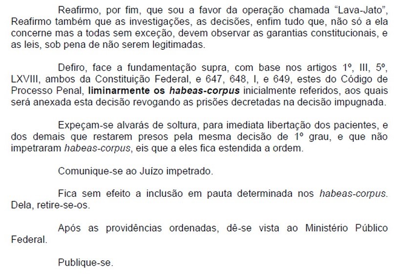 A liminar também determina a soltura do ex-ministro Moreira Franco, de João Baptista Lima Filho, o Coronel Lima, apontado como operador financeiro do suposto esquema criminoso comandado por Temer, e de outros cinco alvos da Operação Descontaminação.