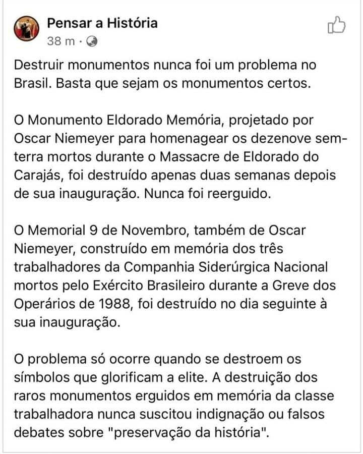 Aliás, esse tal valor histórico, alegado por alguns defensores do Borba Gato estatuado, revela, em verdade, os valores de quem faz esse tipo de alegação.