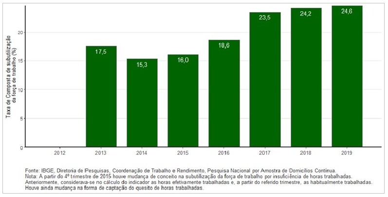 A população subutilizada (27,9 milhões) é recorde da série histórica, com alta de 3,3% (mais 901 mil pessoas) em relação ao trimestre de setembro a novembro de 2018 (27,0 milhões) e de 2,9% (mais 795 mil pessoas) em relação ao mesmo trimestre de 2018.