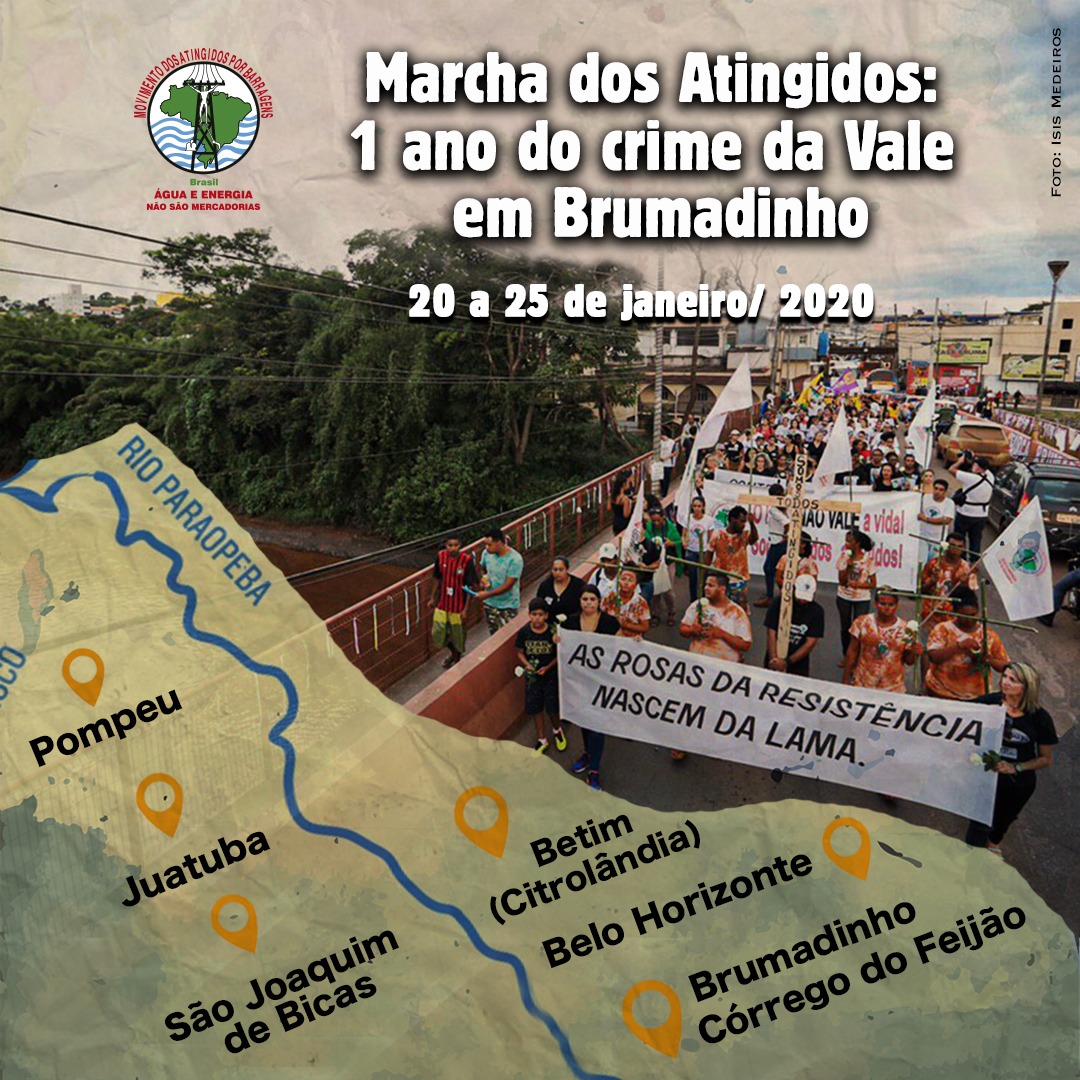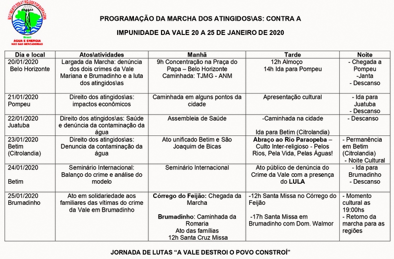 Nesse mesmo dia, os marchantes saem em direção a Pompéu, onde estão previstas atividades no dia 21. A marcha ainda passa pelas localidades de Citrolândia, Betim, até chegar em Brumadinho, no dia 25, quando completa um ano da tragédia.