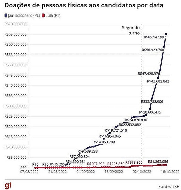 “Pouco mais de duas semanas depois do primeiro turno, o valor aumentou para R$ 65 milhões”, diz reportagem do g1, com base nos dados do Tribunal Superior (TSE).