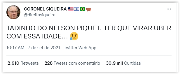 Àquela altura, o irreverente e brincalhão Coronel Siqueira (@direitasiqueira), que já tinha visto o triste flagrante, debochou: “Tadinho do Nelson Piquet, ter que virar Uber com essa idade…