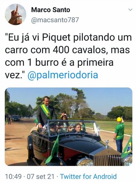 Marco Santo, no twitter: “Eu já vi Piquet pilotando um carro de 400 cavalos, mas com 1 burro é a primeira vez”
