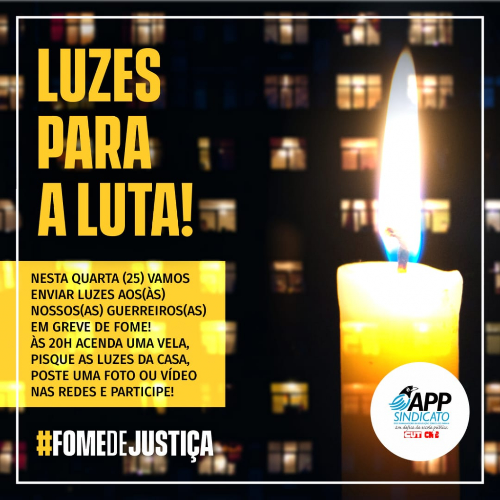 “A ação tem início às 20 horas, para demonstrar respeito e força para os(as) guerreiros(as) que continuam em greve de fome. Para demonstrar respeito e confortar os(as) professores(as) e funcionários(as) de escola que se mantém firmes em sua ação, a APP-Sindicato convida a categoria, estudantes, pais e mães e comunidade escolar para participar de um ato virtual. O sindicato solicita para que sejam enviadas fotos e vídeos com velas, lanternas e pratos vazios utilizando a hashtag #fomedejustiça”, destaca a entidade.