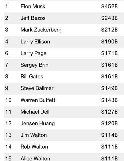 Afinal, ele começou 2024 com uma fortuna estimada em US$ 229 bilhões [229 bilhões de dólares] e terminou o mesmo ano com uma fortuna estimada em US$ 442 bilhões, no topo da lista dos homens mais ricos do mundo!