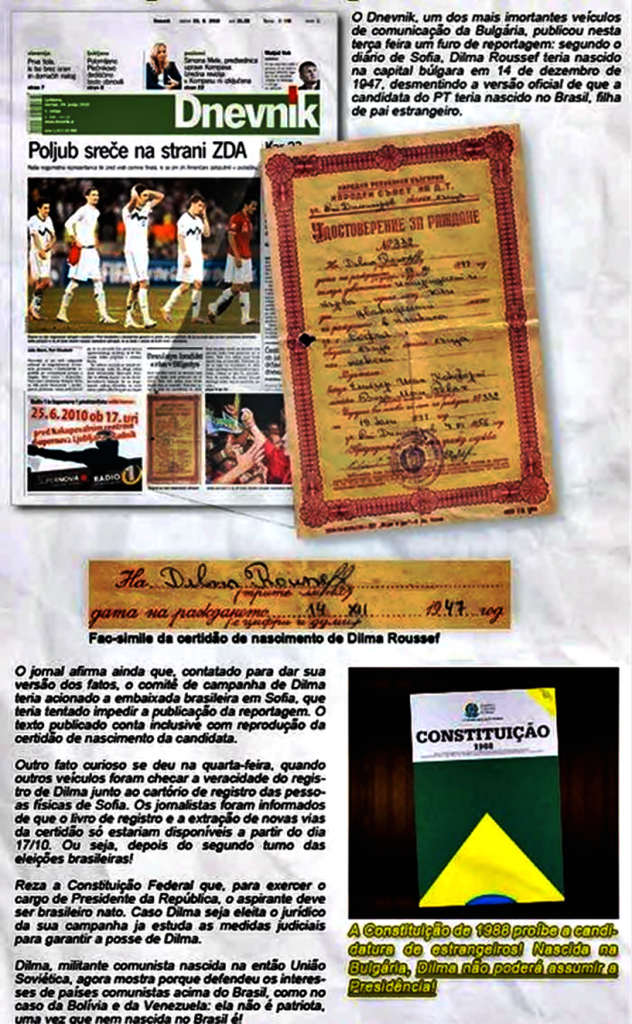 O texto acima é anexo de um e-mail com informações falsas dizendo que Dilma Rousseff, se eleita, não poderá assumir por não ser brasileira (ela nasceu em Minas Gerais). Segue na linha do movimento da extrema-direita dos Estados Unidos, chamado “birther”, que alega que Barack Obama não nasceu nos Estados Unidos e, portanto, não poderia ser presidente. Nos Estados Unidos, onde racismo explícito é inaceitável, foi a forma que a extrema-direita encontrou de carimbar Obama como “alienígina”, um negro que não sabe seu lugar, que não pode representar um país “de cristãos protestantes e brancos”. O ataque a Obama veio acompanhado da tentativa de classificá-lo como “muçulmano”. Ou seja, foi não apenas uma tentativa dos republicanos de ganhar a eleição, mas de “deslegitimar” o eleito ao classificá-lo como alguém que não pertence à Nação.