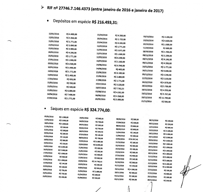 Ele fez saques em dinheiro de R$ 324.774,00 e recebeu depósitos em dinheiro de R$ 216.493,31.