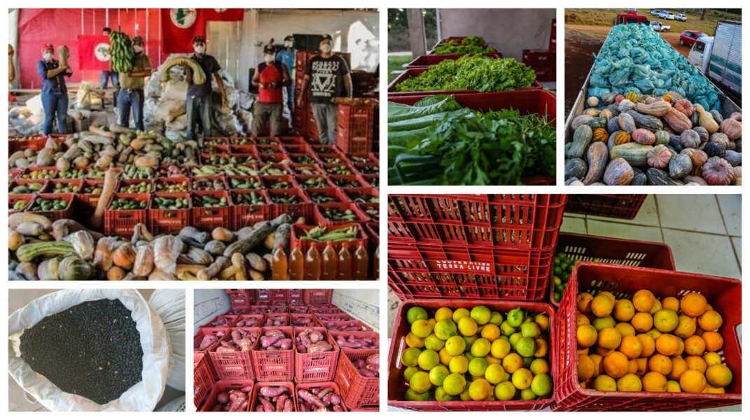 A foto no topo, à esquerda, registra a doação de alimentos do MST do Paraná em 2020. As demais são de alimentos produzidos no acampamento Maila Sabrina e levados para doação, em Curitiba, nesta sexta-feira, 16 de abril de 2021. Fotos: Wellington Lenon e divulgação/MST-PR