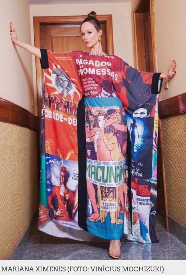 com um belo vestido estampado com cartazes de filmes nacionais,
