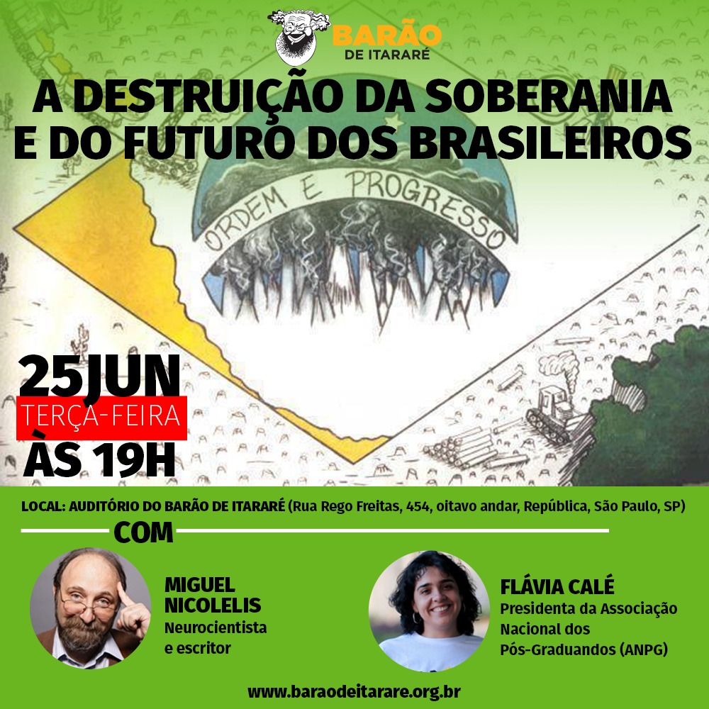 Apesar do eixo “Ciência e Tecnologia”, o bate-papo com Nicolelis e Calé deve abranger não somente os ataques ao setor, mas também ao desmonte institucional, a destruição e o entreguismo praticados pelo governo Bolsonaro.