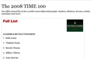 A NovaE para colaborar, foi atrás da mesma noticia, em 2008, seguindo uma dica. Naquela oportunidade, Dalai Lama foi reconhecido, sem telefonemas para a Time, como o mais influente do mundo, com a benção da mídia corporativa brasileira e dos grupos partidários da canditatura Serra, aliás, que após falsamente registrar o prêmio do Lula, com um “é bom pra o Brasil”, se revelou em um desmentido no Twitter, a provar como pode ser rasa uma personalidade pública: