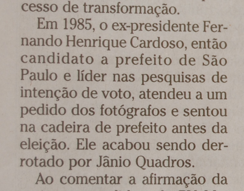 O fato é que, entrevistada na mesma noite no Jornal da Globo, quando questionada a respeito do “já ganhou”, Dilma Rousseff fez referência… a Fernando Henrique Cardoso (sentado na cadeira de Mário Covas, em 1985, antes de perder para Jânio Quadros a disputa pela cadeira):