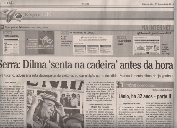 Um amigo lia O Globo a bordo de um avião. Leu em uma reportagem da página 10 do dia 30.08.2010, sob o título Serra: Dilma ‘senta na cadeira’ antes da hora o seguinte parágrafo: