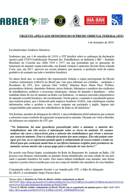 Amianto: organizações fazem apelo aos ministros do STF para que mantenham proibição total