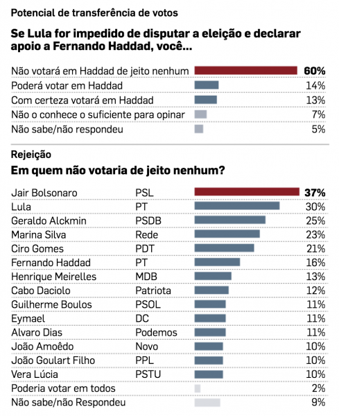 Os números reforçam a preocupação de lideranças petistas sobre a capacidade de transferir todos os votos de Lula para o ex-prefeito de São Paulo, o que garantiria a presença da coalizão PT/PCdoB no segundo turno.
