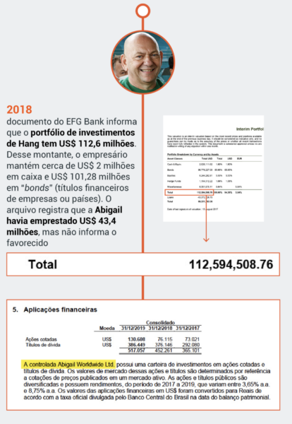 Dos U$ 112,6 milhões que mantém hoje em uma conta na Suiça, outro refúgio fiscal, Hang emprestou U$ 43,4 milhões não se sabe para quem.