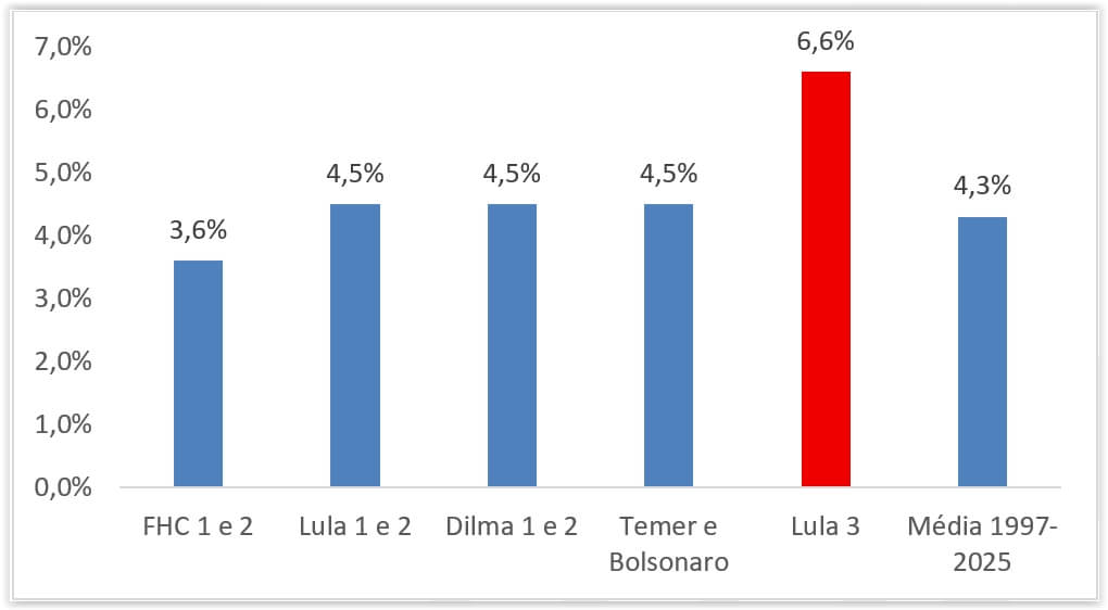 Assim, o que se percebe é que durante o primeiro triênio de Lula 3 esse índice alcança 6,6%, com tendência de manutenção desta média ou mesmo de alta quando forem divulgadas as estatísticas para 2026. Trata-se, portanto, de mais um recorde jamais antes ocorrido para tal variável relevante de política econômica.