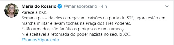“Semana passada eles carregavam caixões na porta do STF, agora estão em marcha militar e levam tochas na Praça dos Três Poderes. Estão armados, são fanáticos perigosos e uma ameaça”. E completou: “Não é aceitável a retomada do poder nazista no século XXI”.