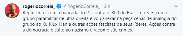 Vários parlamentares da Bancada do PT também utilizaram as suas redes sociais neste domingo para criticar as atitudes do grupo “300 do Brasil”.