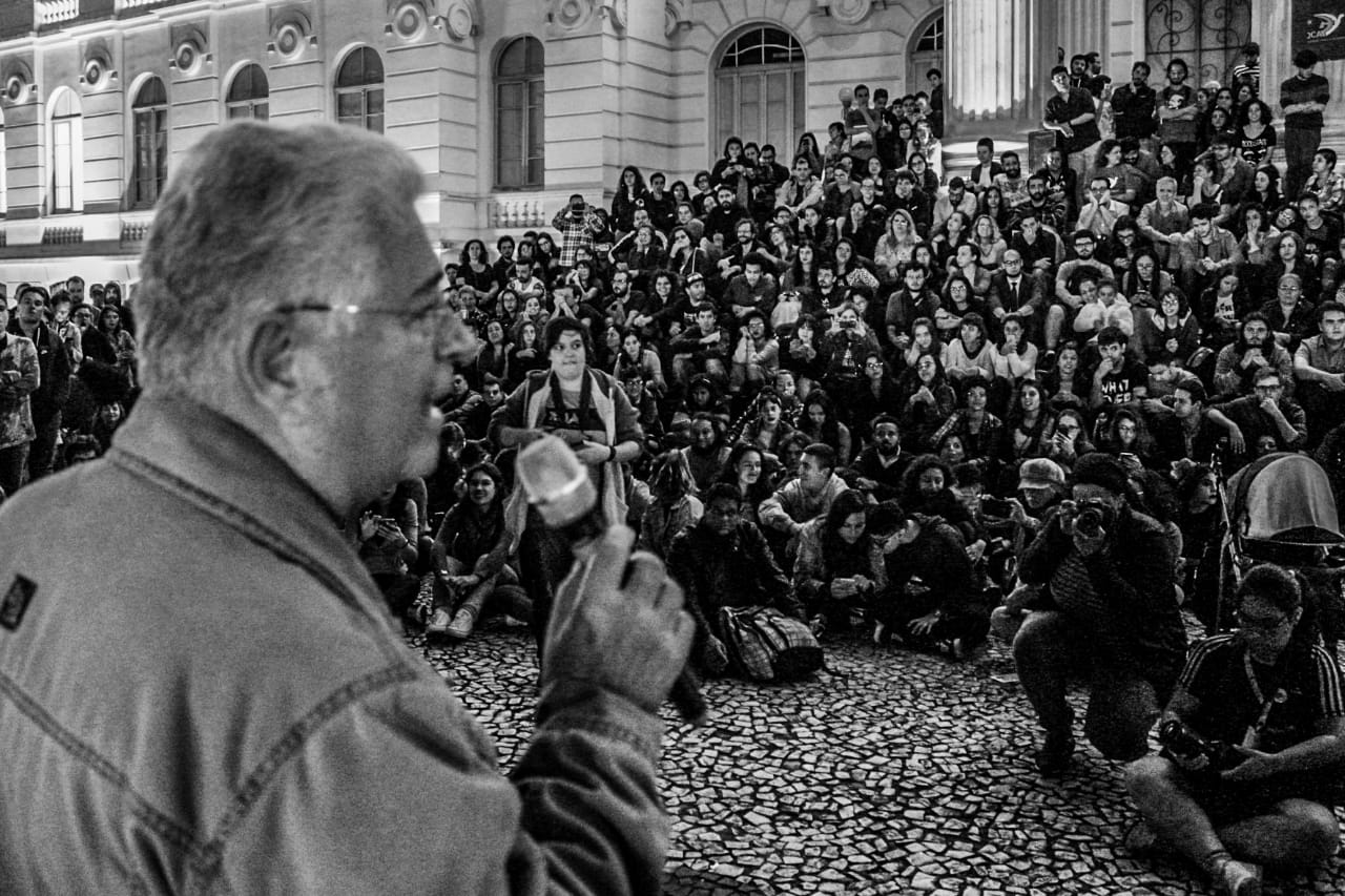 O líder dos moradores sem seto do Brasil, Guilherme Boulos, e o ex-senador Roberto Requião, comandaram no início da noite desta quarta-feira (20), na Praça Santos Andrade, em Curitiba, um ato contra o projeto de reforma da Previdência encaminhado ao Congresso Nacional pelo presidente Jair Bolsonaro.