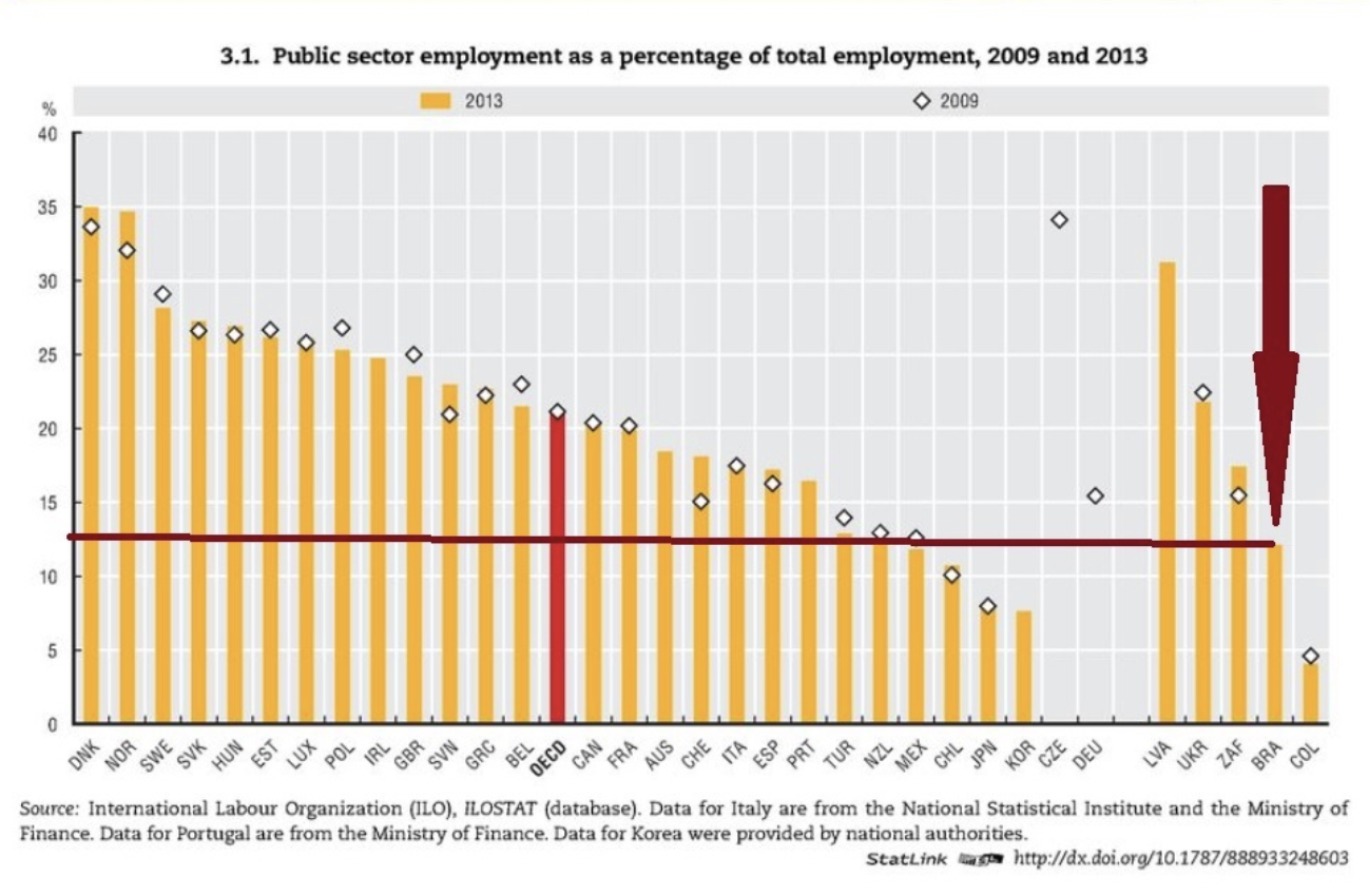 A OIT [Organização Internacional do Trabalho] mostra que o percentual de funcionários públicos no Brasil em relação à força de trabalho total do país [12,1%] fica muito abaixo da maioria de países em desenvolvimento ou desenvolvidos.