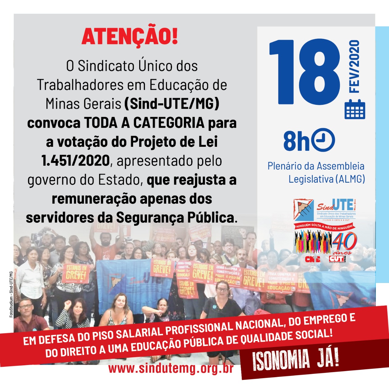 O Sindicato Único dos Trabalhadores em Educação de Minas Gerais (Sind-UTE/MG) convoca toda a categoria e informa que estará presente na votação do Projeto de Lei 1.451./2020, que acontece nesta terça-feira (18/2/2020), às 8h, no Plenário da Assembleia Legislativa.