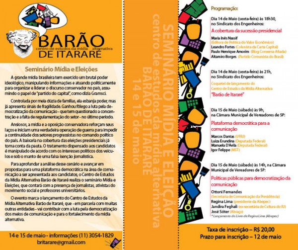 O lançamento do Centro de Estudos da Mídia Alternativa “Barão de Itararé” se dará durante a realização do seminário nacional “A mídia e as eleições de 2010”. As inscrições para o evento se encerram em 12 de maio e custam R$ 20,00. As vagas são limitadas. Os interessados devem entrar em contato com Danielli Penha pelo telefone (11) 3054-1829 ou pelo endereço eletrônico [email protected].